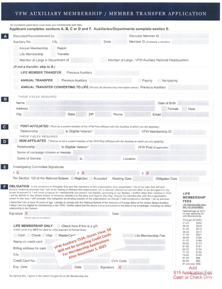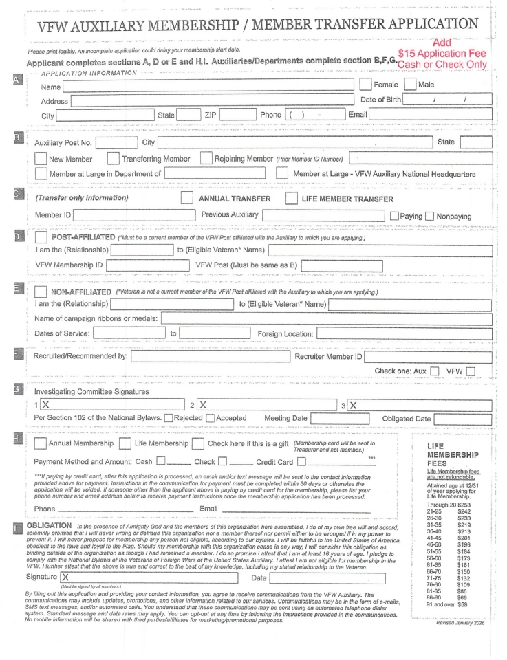 I invite you to visit the Post and complete a VFW Membership Application which is on the wall to the left as you enter through the front door. Alternatively, you can download the application from our Post website at vfw7234.org. Your supporting documentation will need to be attached to your Application, along with the proper lifetime Membership payment (minus the $200!). Once completed you may drop off your application at the Post, or mail it to: